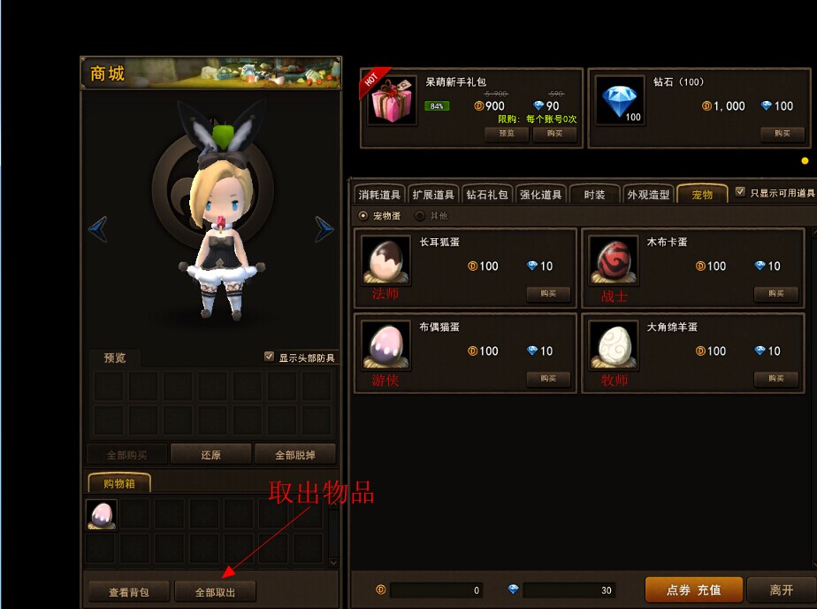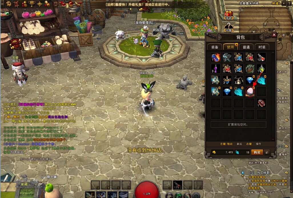 恩,选好宠物后,我们退出商城,按键盘I键进入包裹,点选你的宠物蛋给宠物取个名字吧。